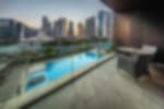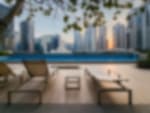 Nestled on the 5th floor, this spacious apartment spans 96 m² / 1033 sq.ft., catering to solo travelers and couples. It accommodates up to 2 adults and a child. The apartment features a bedroom with an ensuite bathroom, wardrobes, a guest washroom without a shower, a living room, a designated dining area, a fully equipped kitchen, and a large balcony with views of Dubai's city skyline and pool.